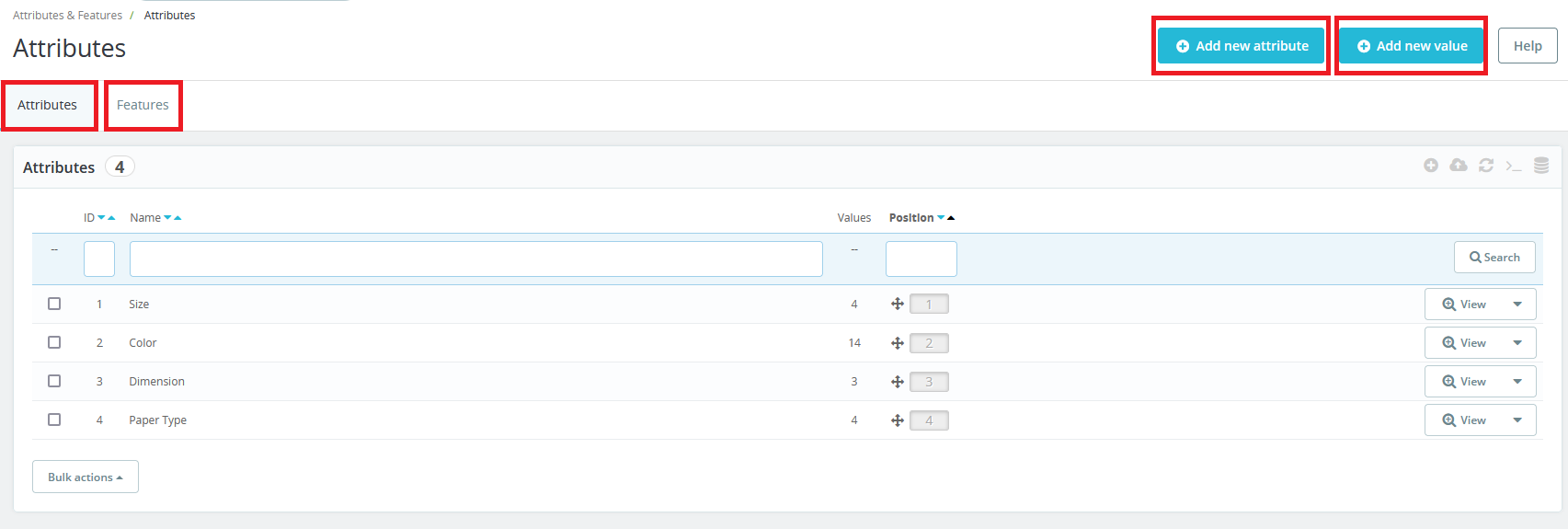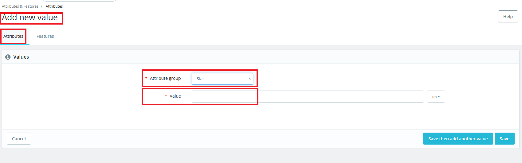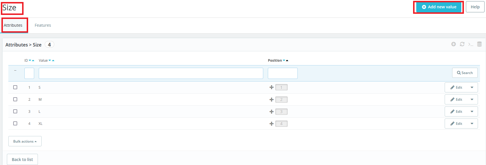 Now, to determine the values related to a attribute, you can either click on the desired attribute and after entering from the upper right part, click on Add new value, or from the same beginning section, this time we will click on Add new value.