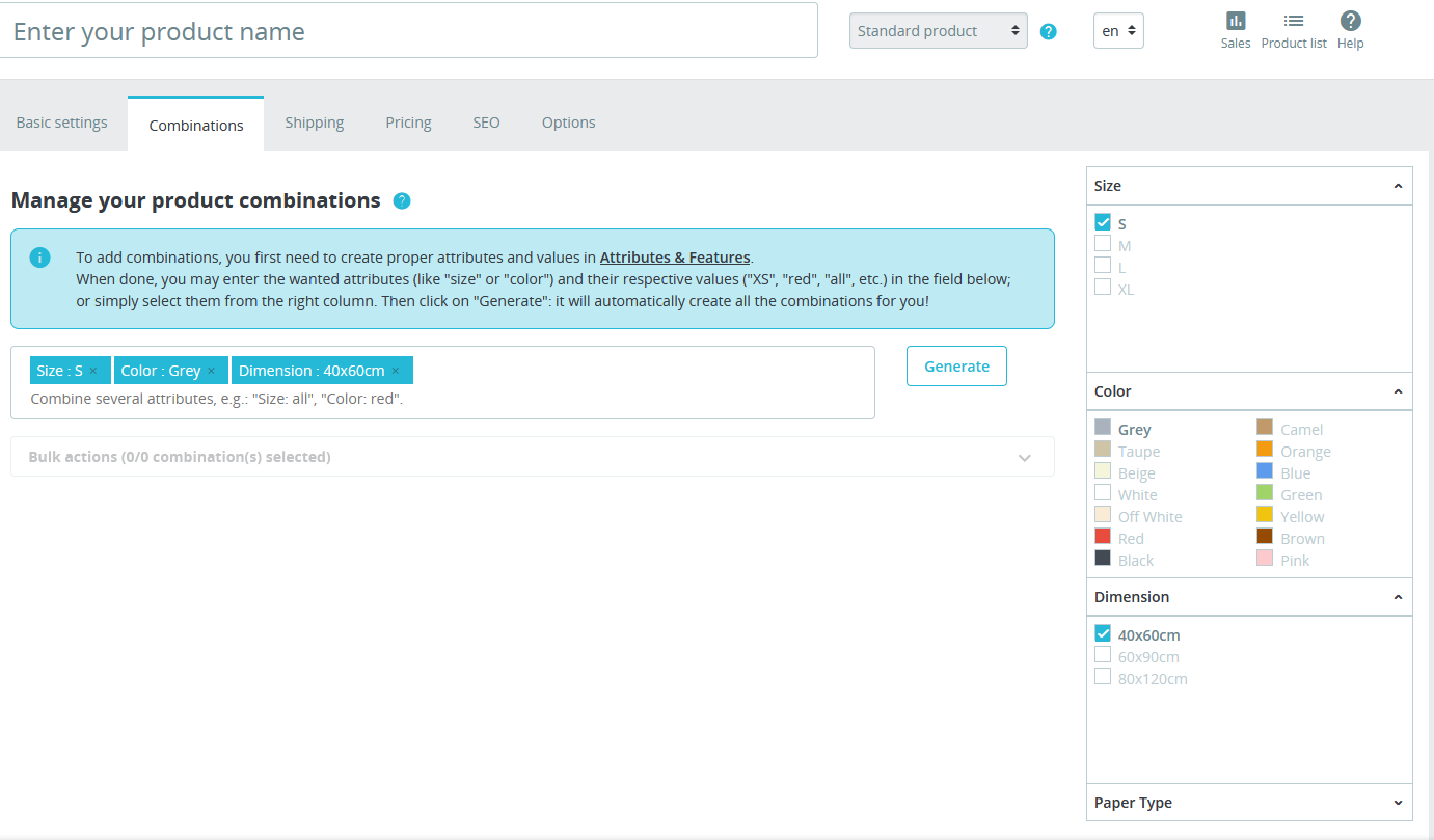 Now, in the combinations tab, the Attributes are displayed on the left side, select any Attributes you want, it will be displayed in the specified box with your selection, then click on Generate.